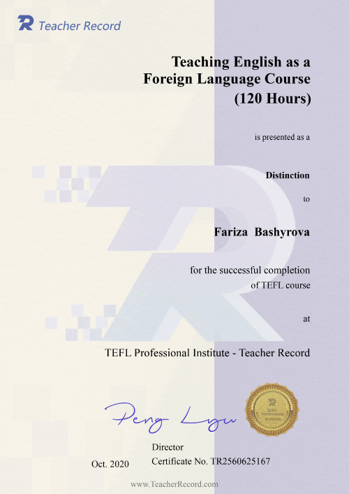 Познакомьтесь, это Фариза — преподаватель, которая не позволит английскому языку запутать вас своими "there", "their" и "they're". Она ответственная, как "Мисс Перфект", целеустремленная, словно марафонец на финишной прямой, честная, как зеркало (не соврет, если ваш акцент звучит как у Мутко), и пунктуальная, как швейцарские часы.
