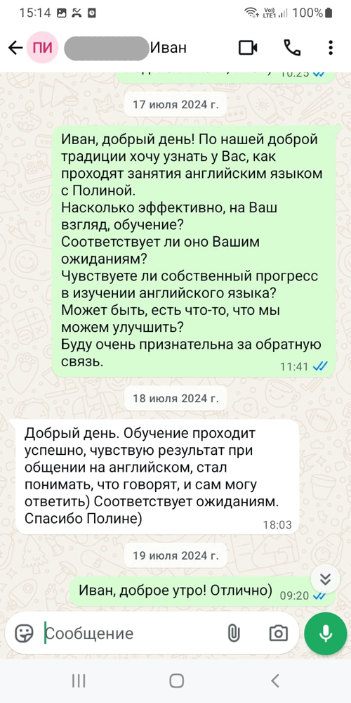 А теперь — история, которую ученики рассказывают друг другу как легенду: один студент пришёл на занятия к Полине с уровнем А1, настолько неуверенным, что даже слово hello из его уст звучало как просьба о пощаде. Но спустя 8 месяцев — внимание! — он сдал IELTS на 7.5. Если бы его прогресс был фильмом, он бы получил «Оскар» в номинации «Лучший образовательный сюжет».