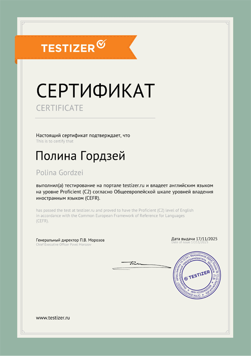 В свободное время Полина открывает новые горизонты: то исследует далекие страны, то погружается в очередной культурный проект. Именно поэтому её уроки — как маленькие приключения. Вы не просто учите английский, вы открываете мир вне своих границ так, как будто держите в руках телепорт.