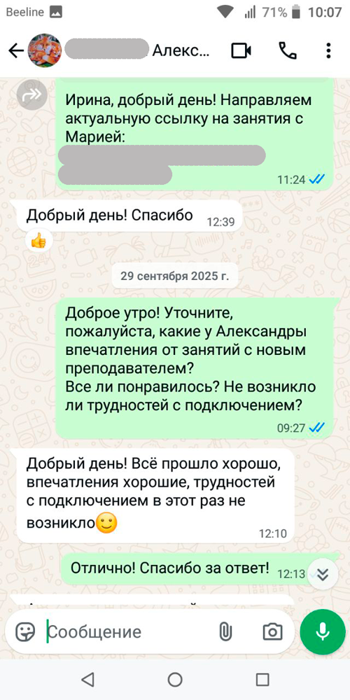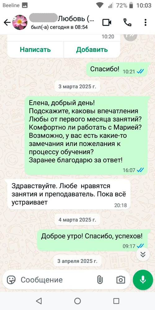 Ученики ценят её занятия не только за эффективность, но и за атмосферу — тёплую, дружескую, иногда даже с лёгким ароматом зелёного чая и шутками о тонах. Материалы, которые она готовит, всегда попадают «в точку»: простые, понятные и такие, после которых действительно хочется учиться дальше.