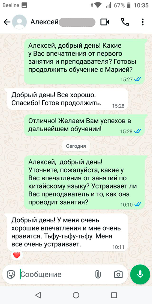 А успехи учеников говорят сами за себя. Один из них недавно сдал HSK 4 и теперь свободно общается с китайцами на работе — и, по слухам, даже научил коллег произносить его имя без ошибок.