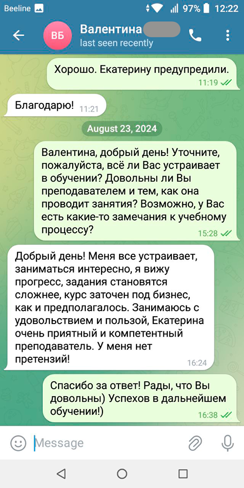 И да, результаты говорят сами за себя. Один из её учеников, начав обучение в русскоязычной компании, уже через год был отправлен вести серьёзный международный проект. Представьте: новый язык, новая страна, новая ответственность — и всё это он прошёл с лёгкостью и отличным результатом. А началось всё с первого «Hello!» на её уроке.